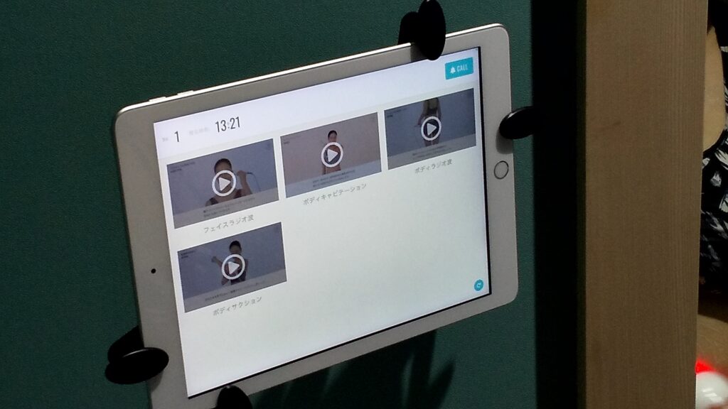 すぐ手が届く位置にタブレットが取り付けてあり、右上の呼び鈴のボタンを押すと、エステティックコーチを呼び出せます。また、タブレットにはマシンとヘッドの使用方法の説明動画があり、説明動画を見ながらセルフエステの施術を行うことができました。